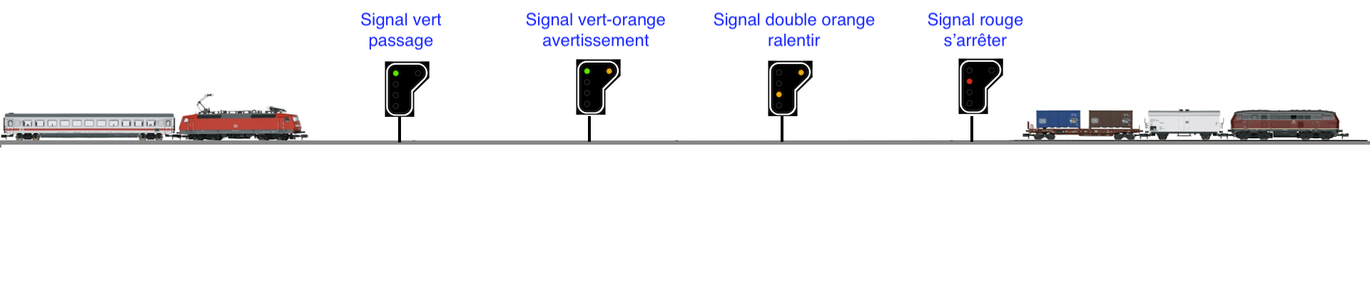 Notons que sur les lignes importantes, où les trains circulent à une vitesse élevée, on ajoute parfois un quatrième type de signal, destiné à avertir le conducteur suffisamment tôt qu'il va rencontrer un signal de ralentissement : c'est le vert-jaune.