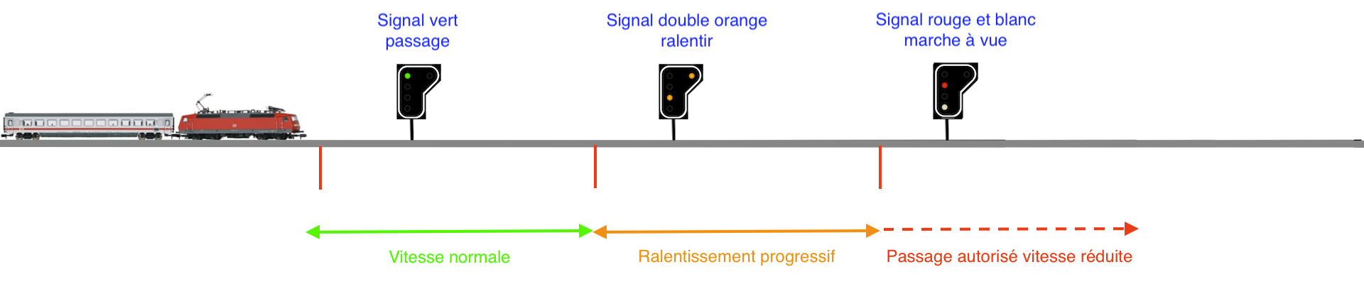 En pratique, les trains ont généralement besoin d'une certaine distance pour s'arrêter, surtout s'ils sont lourds et/ou s'ils roulent à une vitesse élevée : on a donc ajouté un signal supplémentaire, en plus du rouge-vert décrit ci-dessus : le signal de ralentissement, généralement composé de deux lampes de couleur jaune-orange.