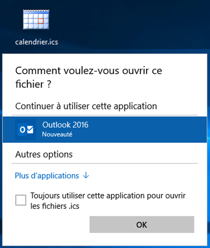Lorsqu'on double-clique sur un fichier qui porte l'extension ICS, le système propose de le lire et d'ajouter des événéments à l'application de calendrier définie par défaut.