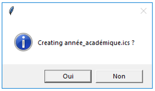 - Si le fichier "ICS" existe déjà, un message d'erreur est affiché, de manière à ce que l'application n'efface pas un fichier existant.