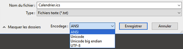 Il n'y a pas de remède miracle, mais une solution consiste à ouvrir le fichier ICS avec un éditeur de texte (par exemple "bloc-notes" ou "notepad" et à resauver le fichier (éventuellement sous un autre nom) avec un autre codage de caractère (ANSI, Unicode ou UTF-8) et de voir si l'interprétation des caractères est correcte dans l'application tierce.